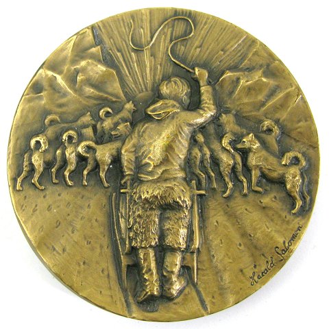 Medaille af Harald Salomen, præget til erindring om 100 års dagen for Knud Rasmussen i 1979. Diameter 70 mm., vægt 258 gr. Nr. XX/2000