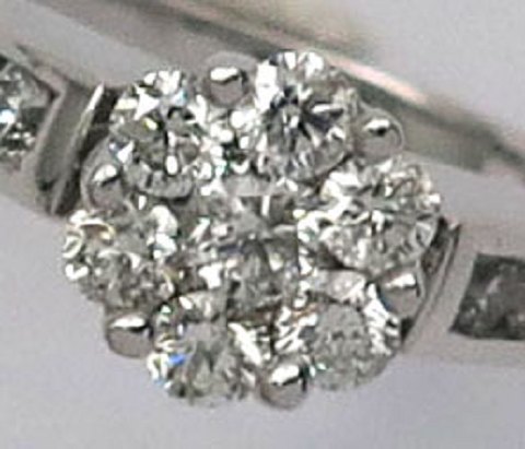 Rosetring af 14 kt. hvidguld, prydet med 7 brillantslebne diamanter på tilsammen ca. 0,40 ct. Desuden på hver side af skinnen 4 små brillanter, ialt ca. 0,10 ct. Ring Str. 50½, samlet vægt ca. 4,2 gr.