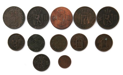 Lot bestående af Norge 1 øre 1899, 2 øre 1876, 1899 og 1906, 5 øre 1876, 1896, 1902 og 1941, Sverige 2 øre 1893 og 1895, 5 øre 1907 samt Danmark, Christian X, 2 øre 1914.