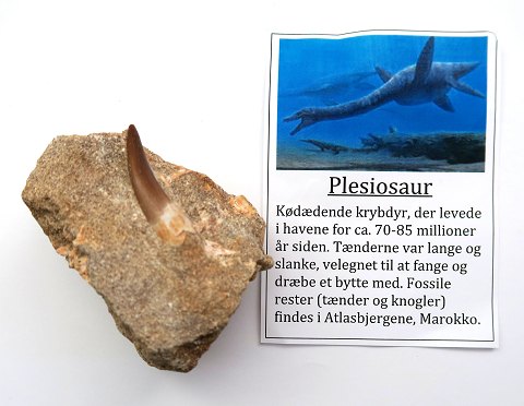 Sjælden fossil, Plesiosaurus hugtand, fundet i Sahara ørkenen ved Atlas bjergmassivet i Marokko. Mellem 70.000 til 85.000 år gammel. Den forstenede tand måler 38 mm. i længden.