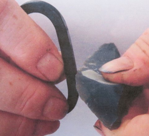 Romersk jern/flint ildstarter, detektorfund fra Sydengland. Jerndel L. 49 mm. Anvendelsesbeskrivelse ses i illustrationen.