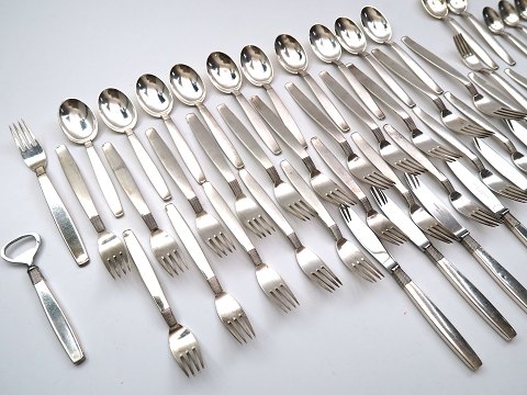 71 dele Frantz Hingelberg bestik Nr. 18 af sterling sølv bestående af 13 frokostgafler, 10 frokost skeer, 12 frokost knive, 12 middagsgafler, 12 théskeer, 6 kaffeskeer, 2 dessertskeer, i kapselåbner, 1 kagespade, 1 kartoffelske samt 1 sauceske. Samlet sølvvægt .925 - ca. 2850 gr.