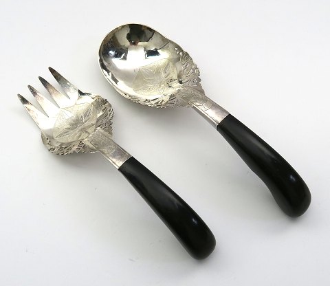Serveringsbestik af sølv i form af gaffel og ske med skaft af ibenholt. Laf rigt dekoreret med gennembrudt slangemønster og hampblade. Arabisk stemplet med fransk importstempel. Samlet vægt ca. 285 gr.