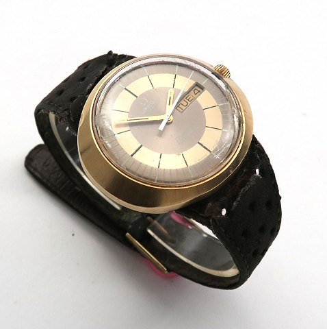 Omega Dynamic herrearmbåndsur, ref. nr. 166.0107 i oval urkasse af forgyldt stål bag plexiglas med integreret læderrem. Tofarvet skive med stregindikation, central sekundviser, dag- og datovisning i #3 position. Automatisk Værk kaliber 1481, Urkasse 40 x 37 mm.