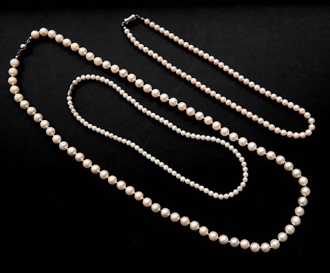 3 kulturperlekæder med lås af henholdsvis sterling sølv (kuglelås) samt metal. Alle med ens perlestørrelse på henholdsvis 8½, 6 og 4 mm. L. hhv. 70 cm., 43 cm. og 42 cm.