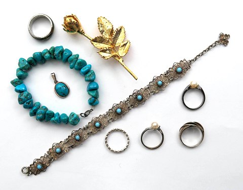 Lot bestående af turkis armlænke, L. 17,5 cm., turkis vedhæng af sterling sølv, 5 rine af sterling sølv, Str. 2x 52, 2x 54 og 1x 53, filigran armænke, L. 20 cm. Guldfarvet broche af kunststof medfølger.