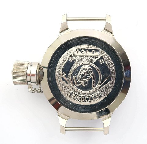 Russisk Militær BMØ CCCP dykkerur, ref. nr. 1210 i gitter beskyttet urkasse af forkromet stål med hvid skive bag mineralglas, arabertal og stregindikation samt separat sekundviser. Ufattelig stor "dykkerklokke" optrækskrone skjuler med fingevinde. Manuel mekanisk optræksværk. Urkasse diameter 58 mm.,