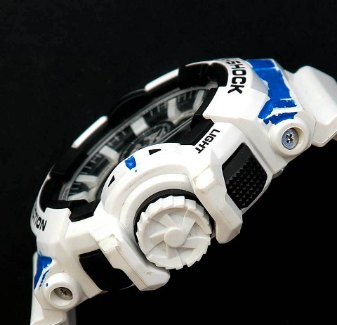 Casio G-Shock herrearmbåndsur, ref. 5398 i hvid urkasse med påført modifiseret blå farve (kan fjernes) af kunststof/stål. 2-D skive med analog og digital tidvisning, sekundviser, samt chronograph funktioner. Quartzværk. Urkasse diameter 48 mm.