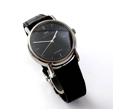 IWC Automatic herrearmbåndsur, ref. nr. IW356502 i urkasse af blankpoleret stål. Sort skive bag safirglas med stregindikation, central sekundviser og datovisning i #3 position. Automatisk værk 35110. Urkasse diameter 38 mm.