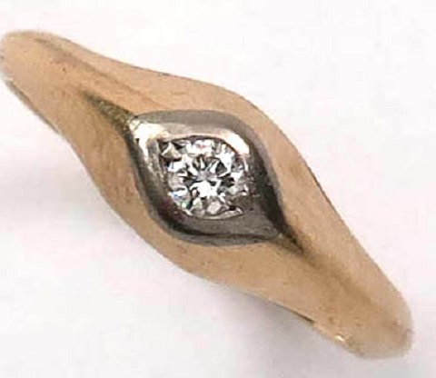 Ring af 14 kt. guld med let forhøjet skinne, pyntet med brillantsleben diamant på ca. 0,10 ct. Ring Str. 53½, samlet vægt ca. 2,8 gr.