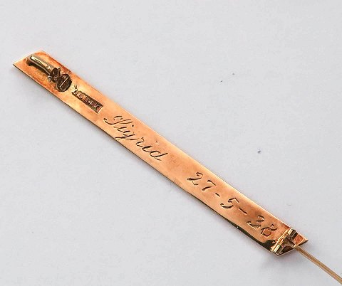 Broche af 14 kt. guld med blomsterdekoreret front. Bagside med inscription og datering. L. 70 mm., vægt ca. 5,8 gr.