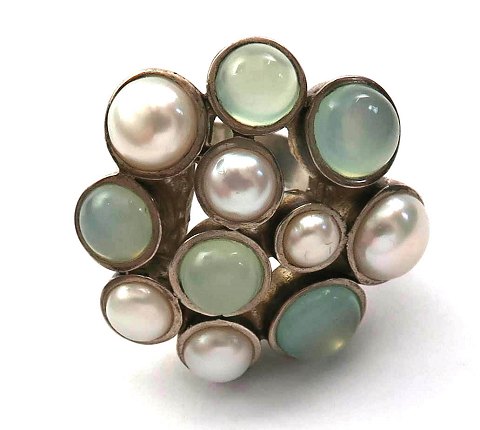 Ring af sterling sølv, prydet med månesten og mabéperler. Front diameter ca. 32 mm. Ring Str. 58
