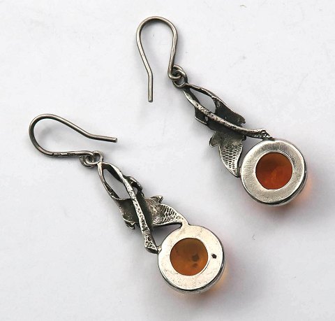 Par ørelokker af sterling sølv i form af bladranke, prydet med cabochonsleben rav. L. 36 mm.