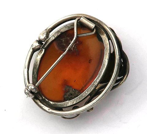 Broche af sterling sølv, prydet med større forarbejdet og cabochonsleben ravstykke 22 x 30 mm., omkranset af bladranke. Broche 30 x 35 mm.