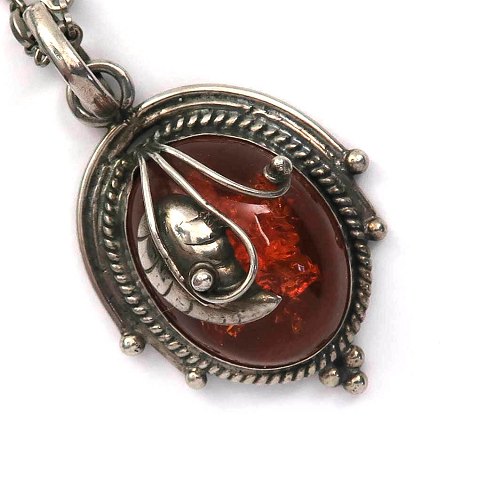 Halskæde af metal med vedhæng af sterling sølv, prydet med større forarbejdet og cabochonsleben ravstykke 16 x 25 mm., omkranset af bladranke. Vedhæng 17 x 23 mm. Kæde L. 46 cm.