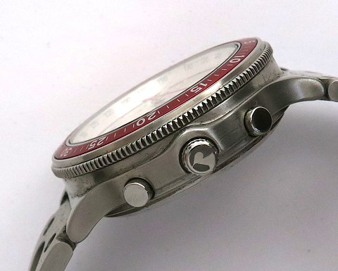 Rosendahl *Tom Kristensen* mid-size armbåndsur, ref nr. Miyota FS 20 i urkasse og med foldelænke af stål. Vinrød lynette med arabertal og stregindeks, sølvfarvet urskive bag safirglas med stregindikation, central og separat sekundviser, tachymeter, datovisning i #7 position samt chronograph funktioner. Quartzværk. Urkasse diameter 34 mm.