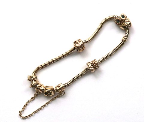 Pandora armlænke af 14 kt. guld med 6 charms, L. 18 cm. Vægt ca. 31,5 gr.