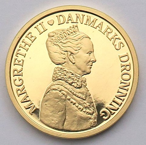 Danmarks første 3.000 kr mønt, præget i 21,6 kt. guld i anledning af H.M. Dronning Margrethes 40 års regeringsjubilæum den 14. januar 2012.