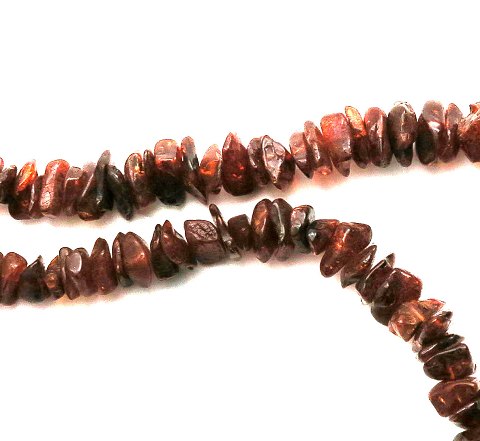 Halskæde af behandlet rav i forløb, L. ca. 65 cm., vægt 50 gr. samt armlænke af rav, optrykket på slatten elastik. L. ca. 19 cm