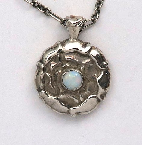 Georg Jensen vedhæng i form af blomster af delvis sort rhodineret sterling sølv, prydet med cabochon opal. Kæde L. 44 cm. GJ opbevringsæske medfølger.