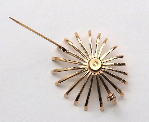 Broche af 14 kt. guld i form af Aurora, prydet med 6½ mm. kulturperle. 35 x 35 mm. samlet vægt ca. 6,8 gr.