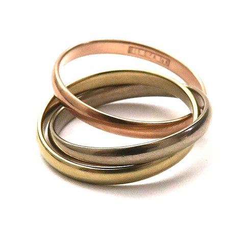 Tre-i-en ring af flerfarvet, 14 kt. guld