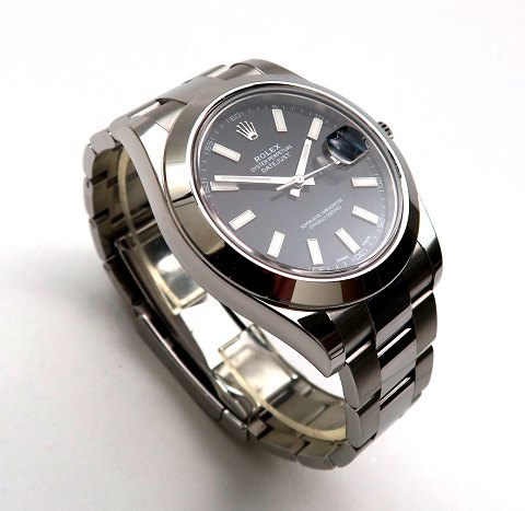 Rolex Oyster Perpetual Datejust II herrearmbåndsur, ref. nr. 116300 i urkasse og med lænke af stål. Sort skive bag safirglas med stregindeks, central sekundviser og datovisning i #3 position.