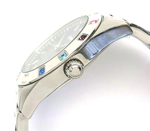 DKNY multicolor damearmbåndsur, ref. nr. NY-8718 i urkasse og med lænke af stål. Lynette besat med farvede , facetslebne sten. Hologram skive med stregindikation og central sekundviser. Quartzværk. Urkasse diameter 36 mm.