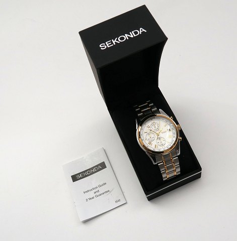 Sekonda chronograph herrearmbåndsur, ref. nr. NG 3878 A i urkasse og med lænke af delvist guldtonet stål. Hvis skive med romertal, central og separat sekundviser, datovisning i #3 position samt chronograph funktioner. Quartzværk. Urkasse diameter 40 mm.