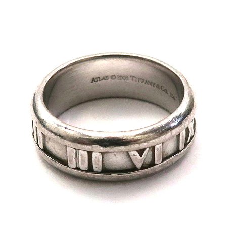 Tiffany *Atlas* ring af 18 kt. hvidguld, skinne rundt om dekoreret med romertal. Ring Str. 53½. Tiffany & Co. 2003. Vægt ca. 10,5 gr.