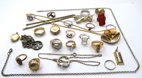 Lot bestående af diverse ringe, vedhæng, kæder, broche og amulet m.v.