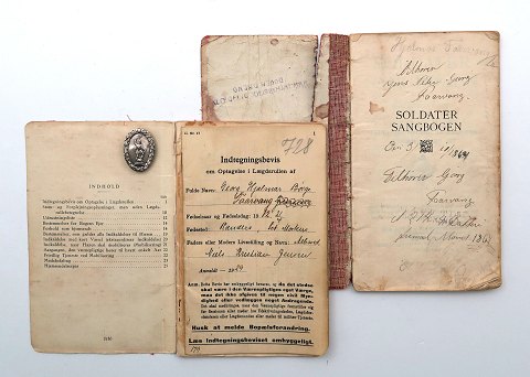 Uniformsemblem af sølv *Den tapre landsoldat*, soldaterbog for korporal samt soldatersangbog oprindeligt udgivet i 1864, dette er sjette oplag fra 1910. Sangbogen fremstår slidt og med revet omslag.