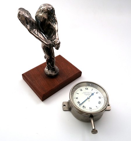 Charles Robinson Sykes, signeret og forsølvet kølerfiguer mærket *Rolls Royce Lmited - February 6th 1911* H. eksklusive plint 18,5 cm., samt dashboard af forniklet metal, mærket S.Smith & Son, London W.C. - serie 281-6658, diameter 9,5 cm.