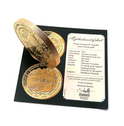 Christian IV medaille af 24 kt.forgyldt metal, limiteret udgave A384 af total 999 fremstillede eksemplarer. Diameter 88,7 mm., vægt 400 gr. Opbevaringsæske og certifikat medfølger. Præget efter forlag af Orietta Rossi.
