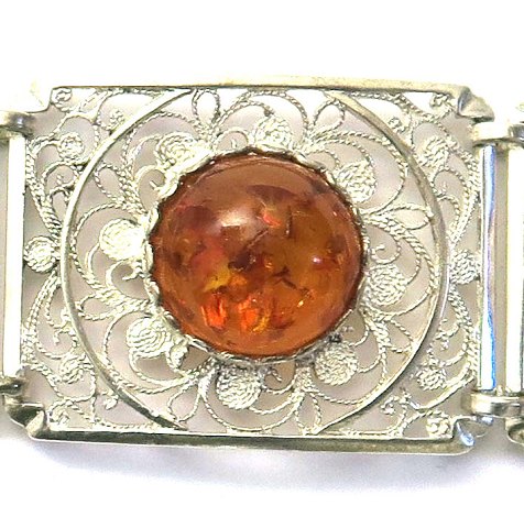 Filigran armlænke af sølv 0.830, prydet med cabochonslebne, forarbejdede ravperler. L. 19,3 mm., stemplet EF - Einer Fehrn.