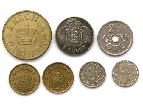 Danske årgangsmønter i bedre kvaliteter. 2 kr. 1940, 1 kr. sølv 1875, ½ kr 1926 og 40, 25 øre 1911 og 1919 sølv, samt 25 øre 1947 cn.