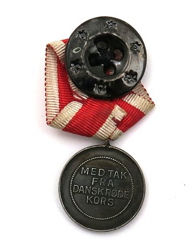 Medalje, Røde Kors, miniature. Fs Røde Kors symbol i emalje over olivengrene og teksten; I krig, i fred, barmhjertighed. Bs Tekst; Med tak fra Dansk Røde Kors.