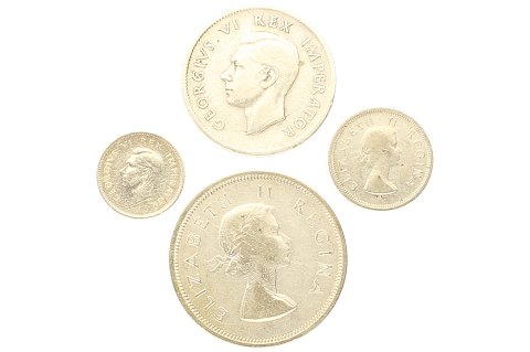 Sydafrika, 3 pence 1945, 6 pence 1960, 2 shilling 1942 og 2,5 shilling 1957, Georg VI - Elisabeth II, sølv
