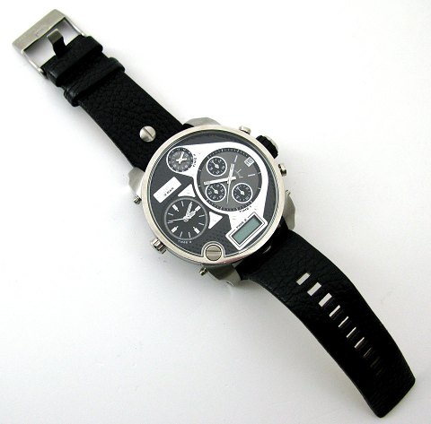 Diesel Mega herrearmbåndsur i urkasse af stål, model DZ 7125. Skive med sort bundfarve og metal opbygning, visende 4 tidszoner, heraf en digitalt. Derudover datovisning i #3 positionen, central og separat sekundviser samt chronographfunktioner. Quartsværk. Urkasse diameter 57 mm.!! Læderrem med metalspænde.