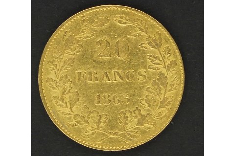 Belgien, 20 Francs, 1865 L Wiener, guld