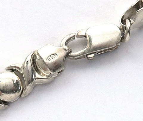Halssmykke af sterling sølv med cross-over led, hvorimellem sølvperler. L. 42 cm., vægt ca. 37 gr.