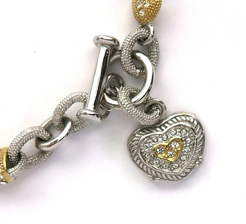 Collier af delvist forgyldt sterling sølv med perlebort strukturerede led, delvist forgyldt og prydet med klare sten. Hjerteformet vedhæng ligeledes delvist forgyldt og prydet med klare sten. L. 45 cm., samlet vægt ca. 52 gr.