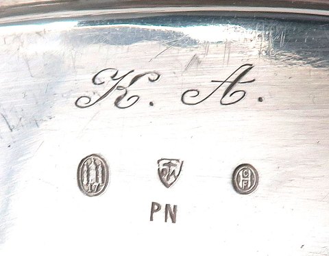 Kaffestel i barokform af sølv, bestående af balusterformet kaffekande på fire ben, bakke samt sukker og fløde sæt. Ligeknækket korpus, dekoreret med akantusblade og bladguirlande. Kaffekande H. 28 cm., samlet vægt på alle fire dele 1615 gr.