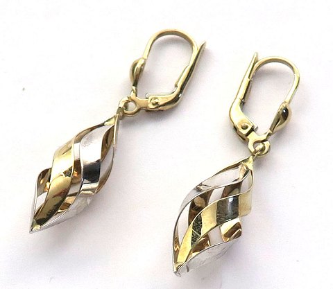Par ørelokker af 8 kt. tofarvet guld i form af snoet dråbe. L. 38 mm., vægt ca. 2,5 gr.