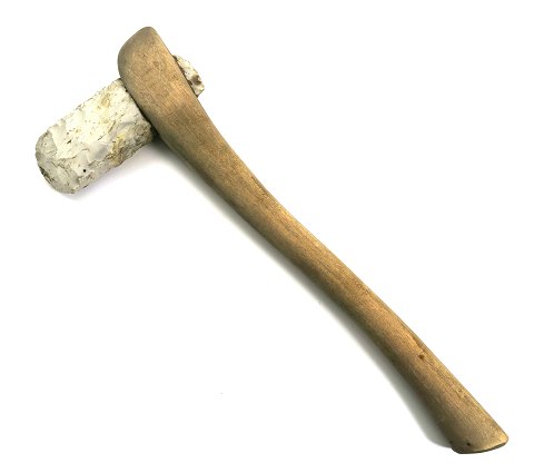 Tilhugget flinteøkse, gennemgående monteret i skaft af bøgetræ. Øksehoved L. 18,5 cm. Neolitisk stenalder, fundsted ikke oplyst.
