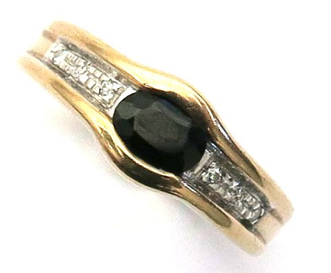 Ring af 9 kt. guld, prydet med oval, facetsleben safir, flankeret af 6 brillantslebne diamanter, samlet ca. 0,03 ct. Ring Str. 53½, samlet vægt ca. 3,5 gr.