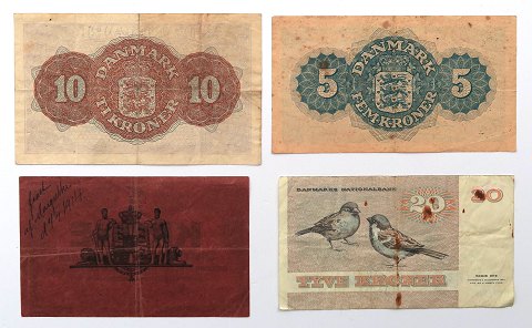 Danmark, 20 kr. 1988, 10 kr. 1944, 5 kr. 1949 og 1 kr. 1914 (4)