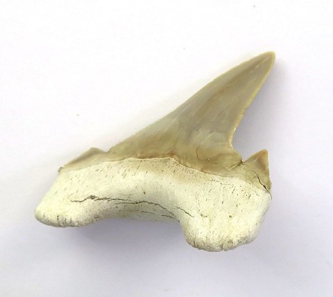 Fossil hajtand fra Otodus obliquus haj, ca. 60 mio. år gammel. L. med rod henholdsvis 65 mm.