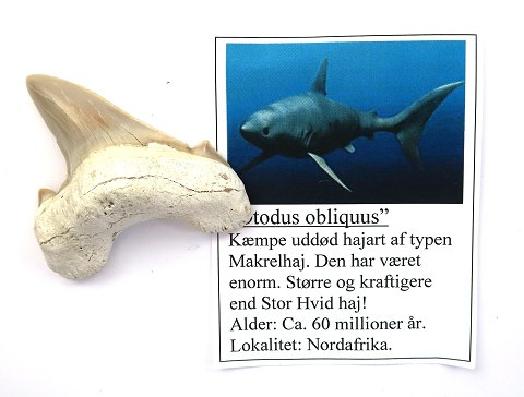 Fossil hajtand fra Otodus obliquus haj, ca. 60 mio. år gammel. L. med rod henholdsvis 65 mm.