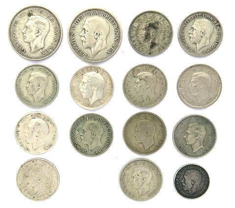 Lot bestående af One Shilling sølv 1928 og 1937, 2x Sixpence sølv 1918, -31, -33, 39, 3x 1942, -44 og 3x 1945 samt Threepence sølb 1916.